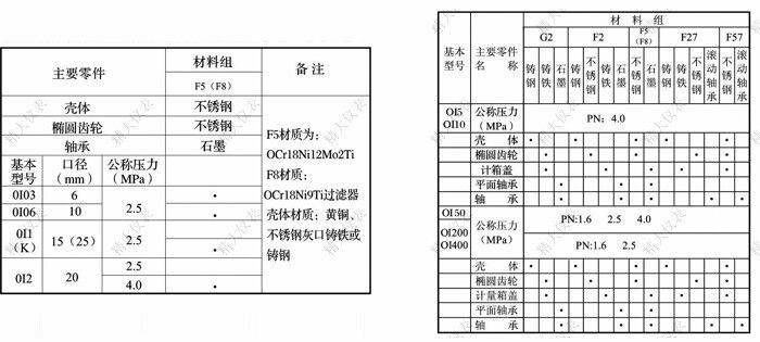 備注:1.F5材質為OCr18Ni12Mo2Ti;F8材質為OCr18Ni9Ti,其他材料組中不銹鋼均為F8.