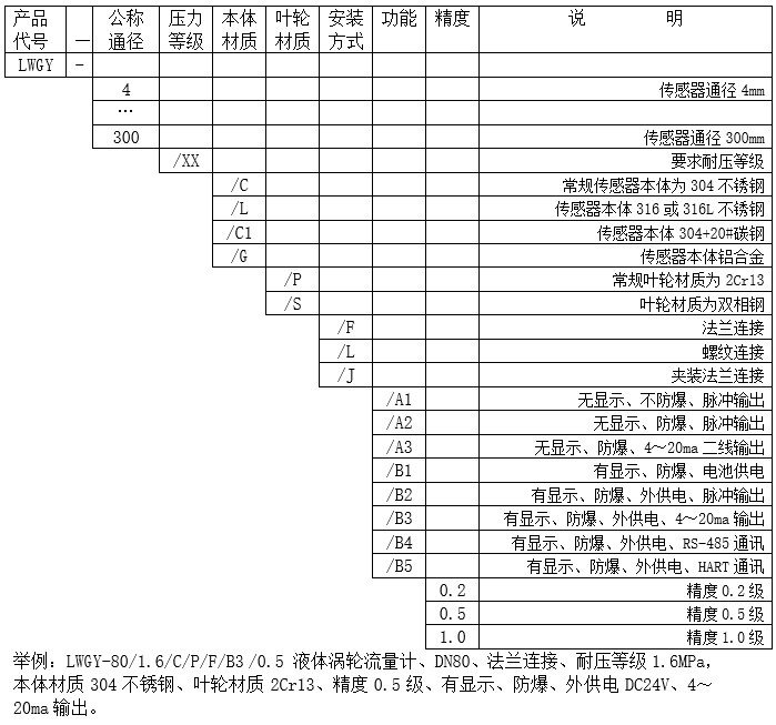 LWGY型液體渦輪流量計是一種速度式流量測量儀表。用于測量充滿于封閉管道中連續流過、較低粘度的清潔液體體積流量。流量計可輸出對應通過流量計的體積瞬時流量、累計流量的電信號,供自動化系統使用。