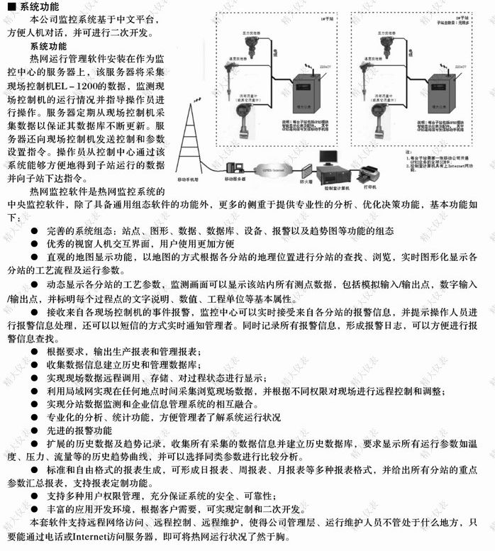■概述 一個無線遠程數據傳輸與管理系統,在物理層面上它主要由四部分組成:監控中心、通訊網絡、現場監控設備 一次儀表;在軟件層面上主要包括三部分:現場控制軟件、通訊軟件、中央監控調度軟件。 遠程終端通過(]PRS~重訊網絡與監控中心實現實時通訊、數據傳輸。監控中心采集過程數據,并提供操作指 導、控制、報警、報告、歷史數據處理,趨勢顯示等主要功能。