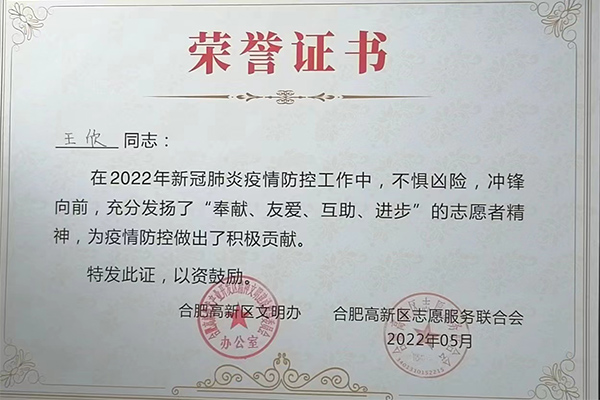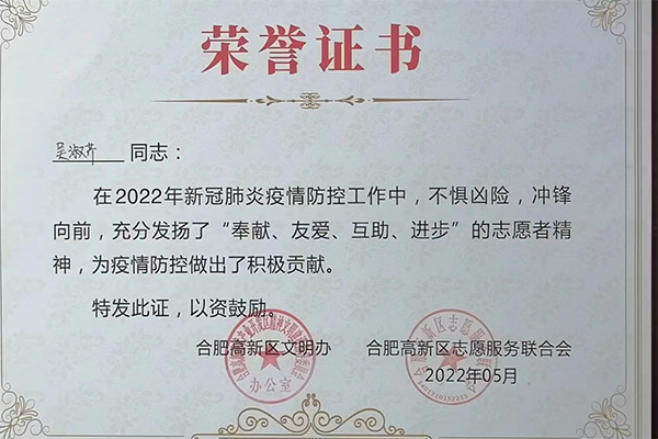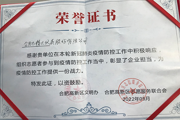 合肥精大儀表股份有限公司在新冠肺炎疫情防控工作中積極響應,組織志愿者參與到疫情防控工作中,彰顯了企業擔當,為疫情防控工作提供一份戰力。黨員王欣、吳淑芹二位同志在2022年新冠肺炎疫情防控工作中,不懼兇險,沖鋒向前,充分發揚了“奉獻、友愛、互助、進步”的志愿者精神,為疫情防控做了了積極的貢獻。公司和個人被高新區文明辦、和高新區志愿服務聯合會授予此榮譽證書。