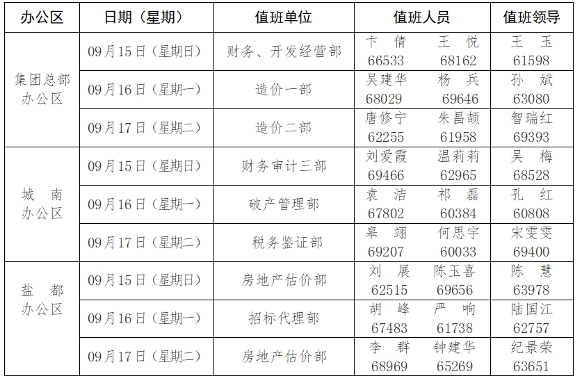 放假期間,加班、值班人員統一在OA系統中登記、定位報備,由當日帶班領導安排值班人員統計后,統一在集團QQ群里發布。假期期間食堂不供應工作餐,9月18日(周三)起正常開伙。